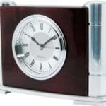 Desktop wooden clock with metal pillars
