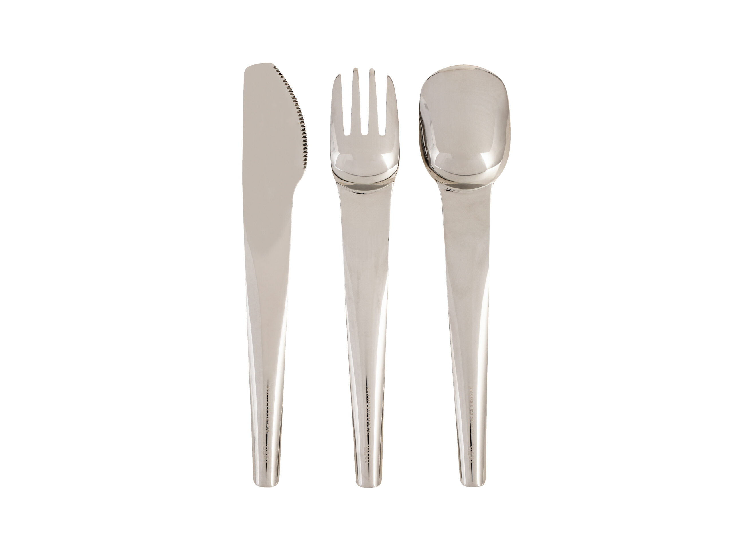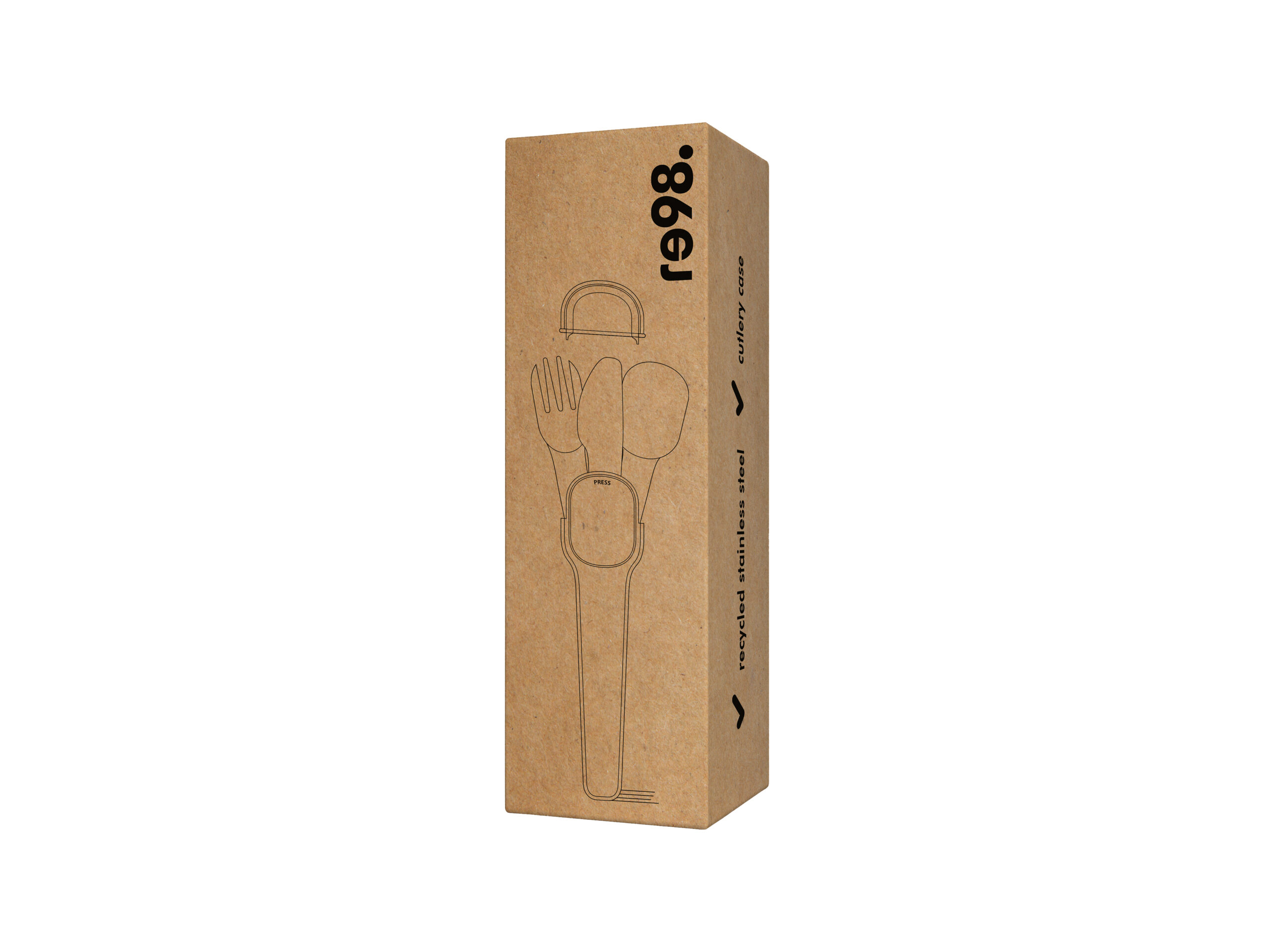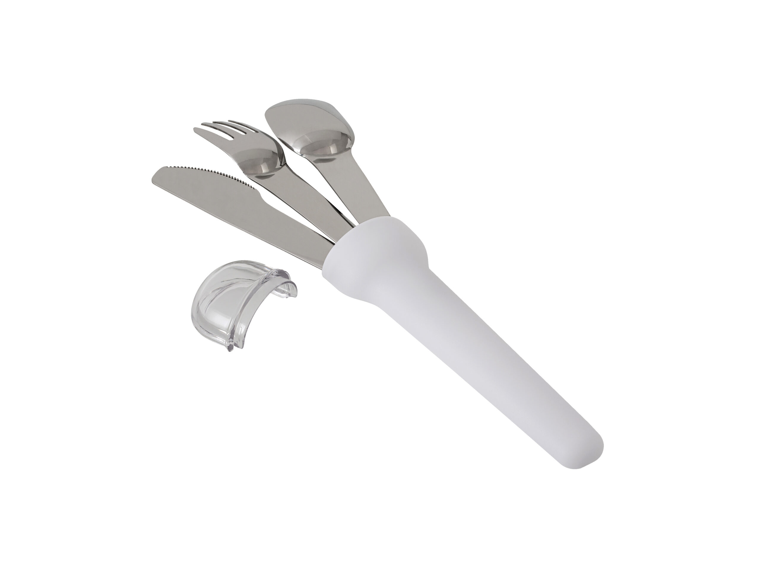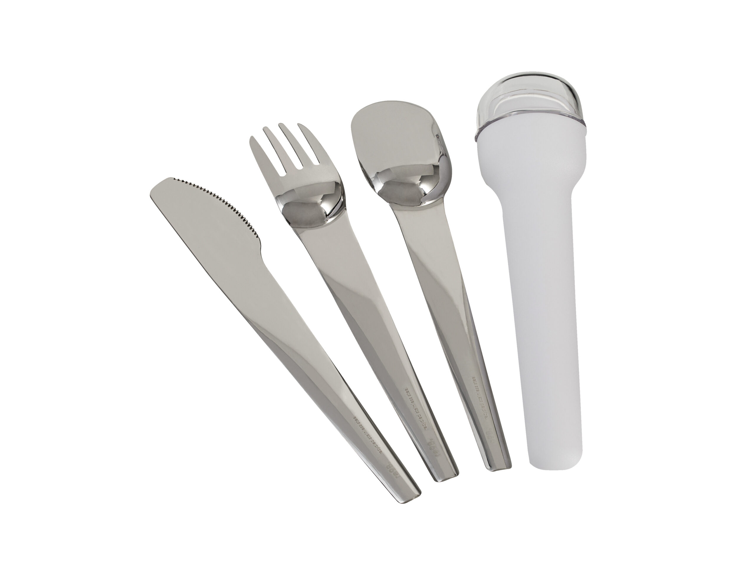 A sleek white case made from recycled polycarbonate and polypropylene ensures hygienic storage: the three utensils stack intuitively, sit snugly inside, and the transparent cap locks securely with a simple “Press” action. The case doubles as a knife rest when opened — preventing utensil heads from contacting surfaces for added cleanliness. All components are dishwasher safe for effortless maintenance. This cutlery set is ideal for stylish picnics, travel, office lunches, and refined outdoor dining.