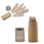 Set of 12 mini recycled colour pencils enclosed in an eco-friendly cylindrical box with a sharpener in the transparent lid