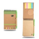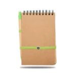 Colorful eco-friendly 70 page spiral note pad with recycled brown paper along with a eco friendly matching color pen and highlighted page markers with matching elastic closure. It also holds an inbuilt day guide spinner which portrays the current day as set by the user for convenient day tracking