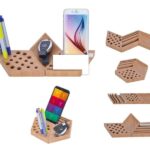 Eco friendly modular bamboo 3pcs desk set.  Three diamond shaped bamboo pieces with magnets embedded on the sides to create your own combination set. Each module serves a different purpose such as mobile/ tablet holder, business card slot, pen stand, memo slot and accessories slot. Run your imagination to create your very own unique desk set, and rearrange at your will.