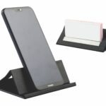 Folding desktop magnet phone stand, with business card holder and ample space for  branding on the front metal plate / on the front black leatherette