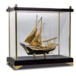 Metal/ brass model of a Traditional Arabic dhow placed in an acrylic/ wooden golden case. Making it an appropriate executive farewell gift for a retiring staff or employee recognition souvenir. Available in ready stock for wholesale as well.