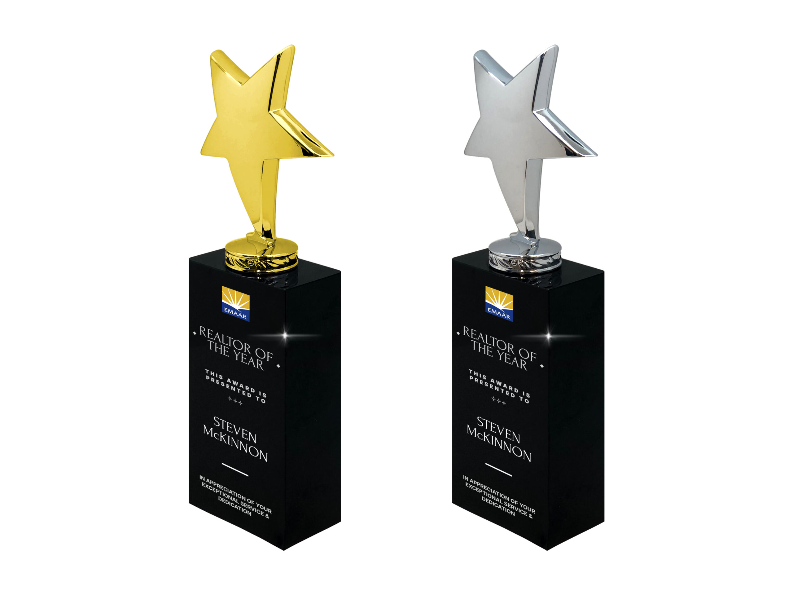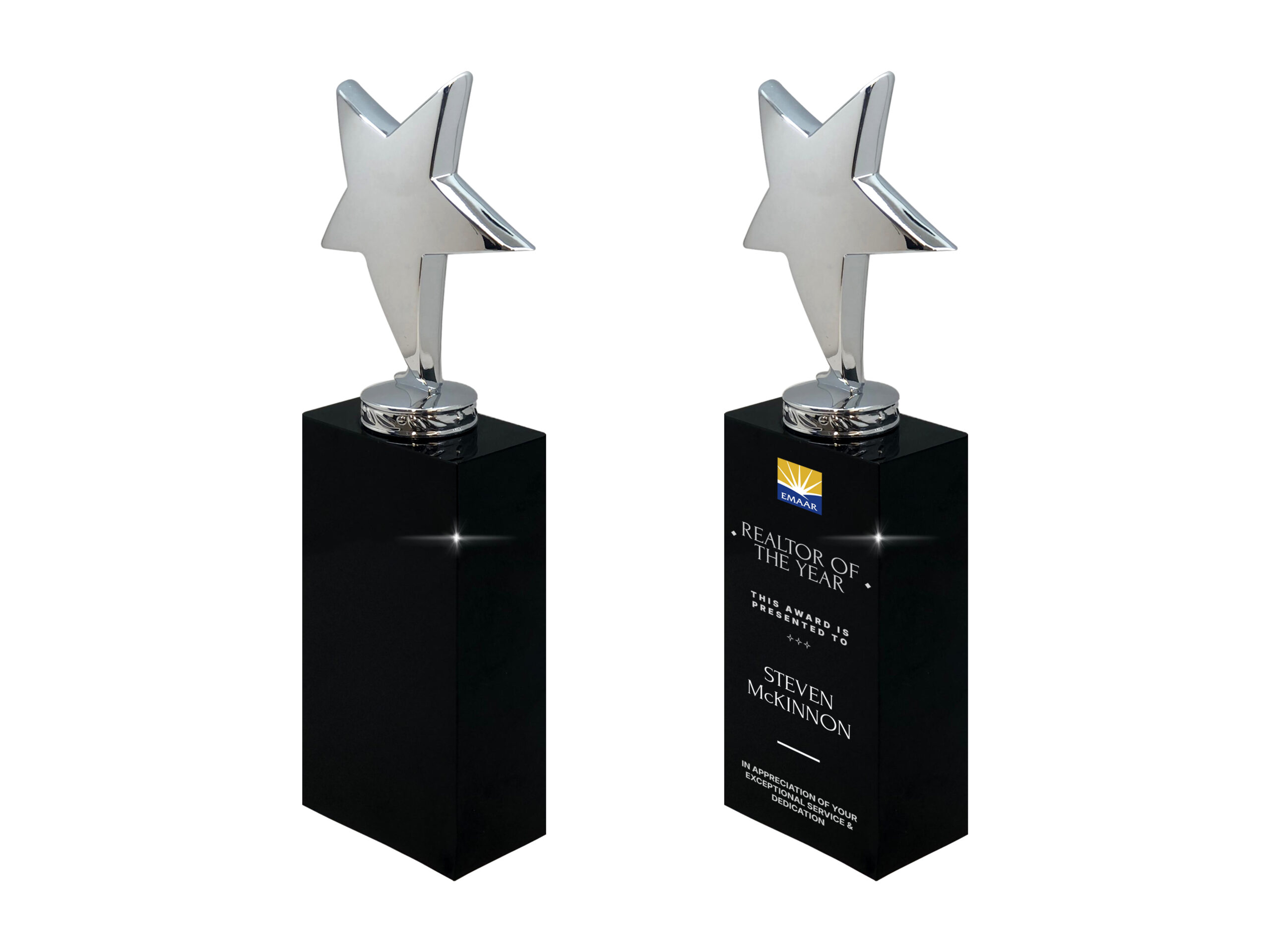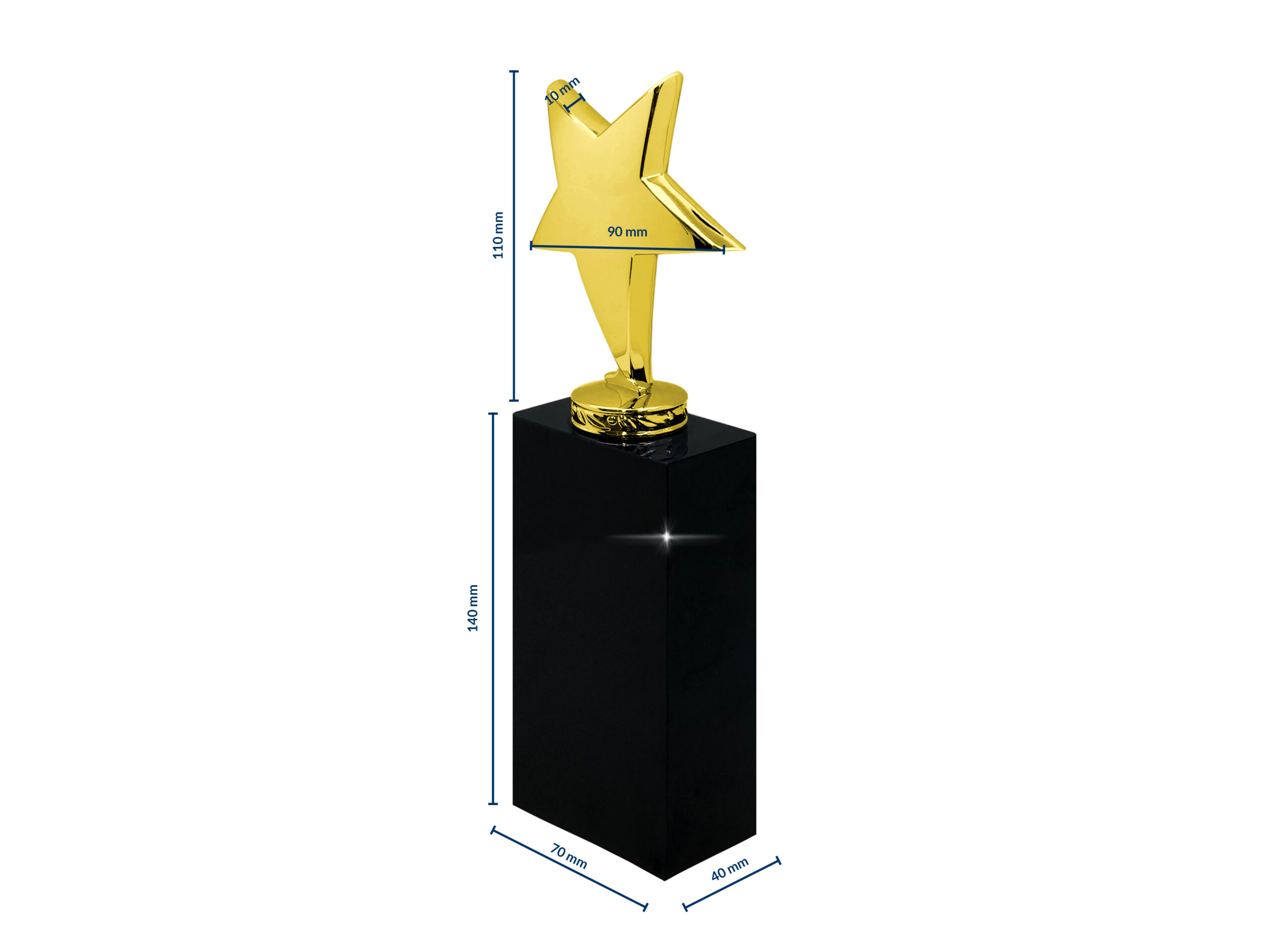 Celebrate excellence with a trophy that shines as brightly as the achievement it honors. This premium star-shaped trophy features either a luminous gold or silver metal star atop a sleek crystal black base. Designed for high-end recognition events, it’s ideal for corporate awards, sports achievements, employee appreciation or milestone celebrations.