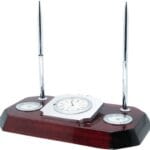 Desktop clock, thermometer, hygrometer, with compass below the clock, and double pen