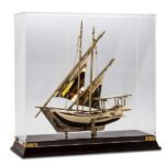 Metal/ brass model of a Traditional Arabic dhow (Mintaka boat) placed in a small acrylic/ wooden golden case. Making it an appropriate executive farewell gift for a retiring staff or an employee recognition souvenir. Available in ready stock for wholesale as well.
