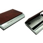 Business card case in leatherette and steel combination, this model can hold up to 20 business cards.