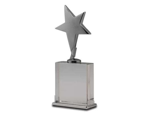 Premium award with shiny chrome plated metal star, on a crystal base. Branding can be done directly on the crystal base, or on a brushed metal plate placed over the same.