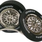 Set of four tyre shaped coasters, housed in a metal casing, with branding space on the metal casing. An ideal desktop gift for the well heeled executive